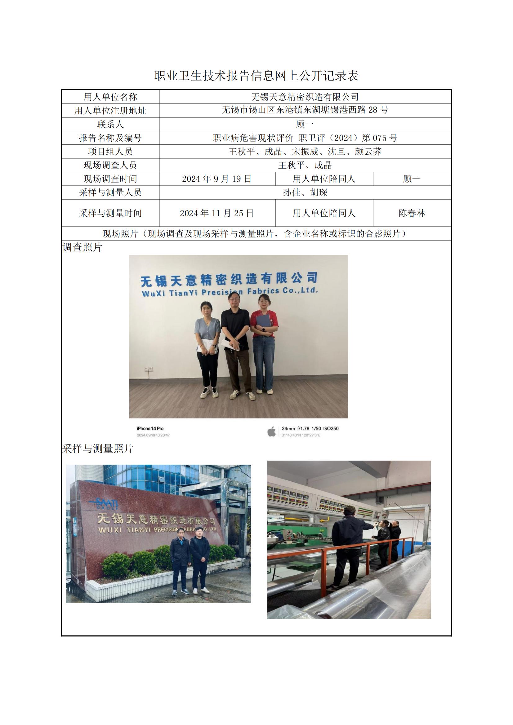 现场采样每日上报(无锡天意精密织造有限公司)