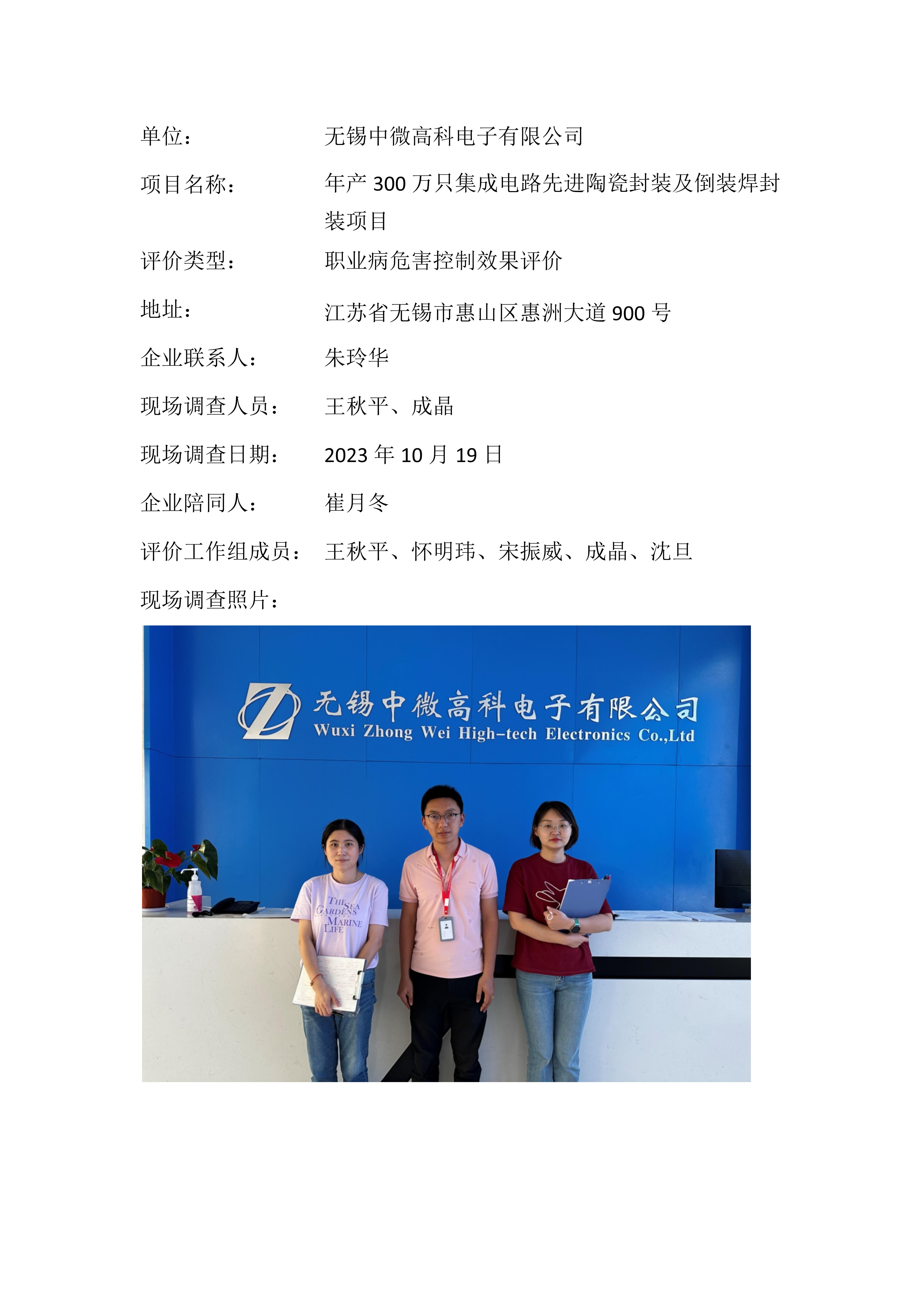 【职业病危害控制效果评价报告】无锡中微高科电子有限公司
