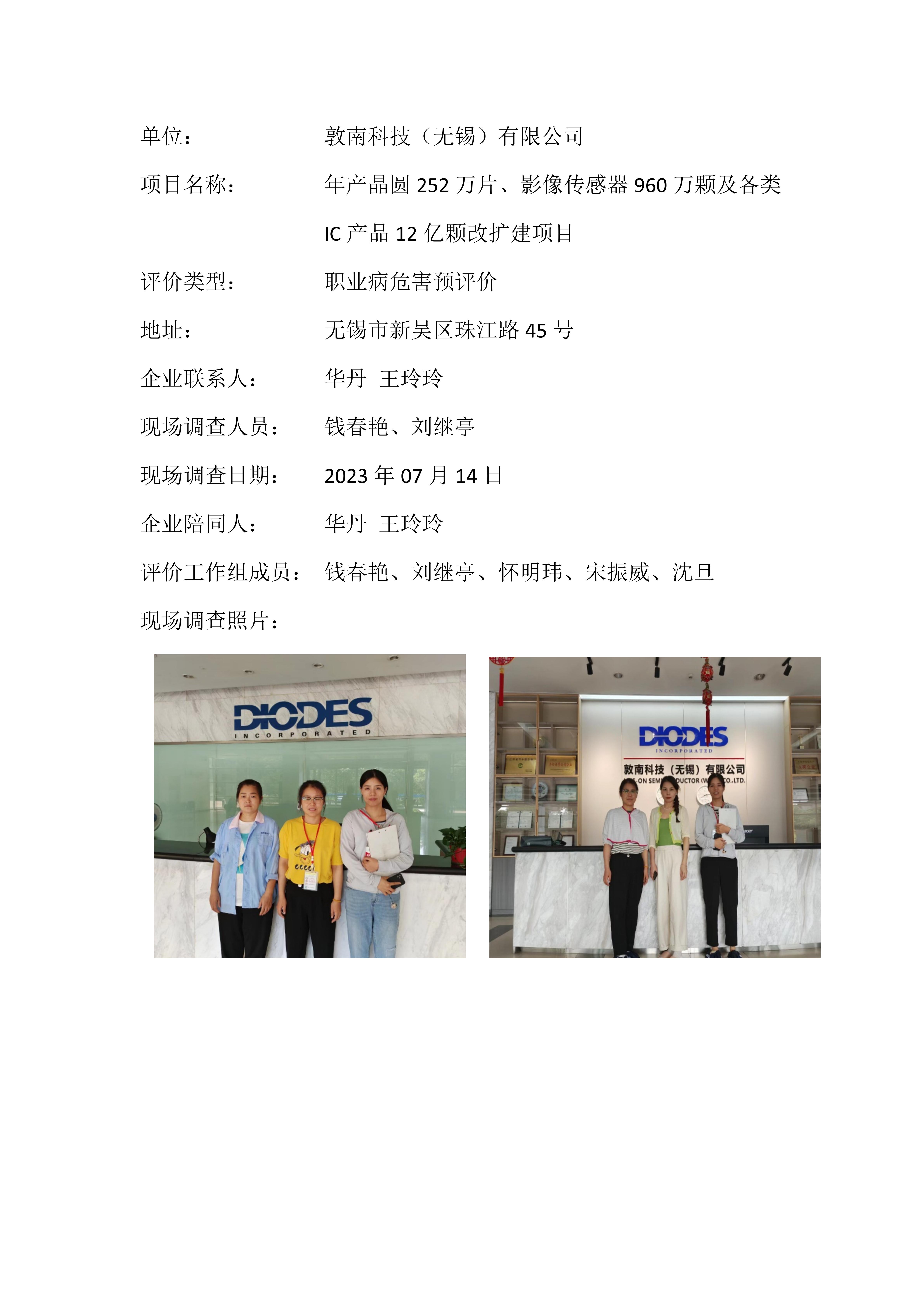 【职业病危害预评价报告】敦南科技(无锡)有限公司年产晶圆252万片、影像传感器960万颗及各类IC产品12亿颗改扩建项目