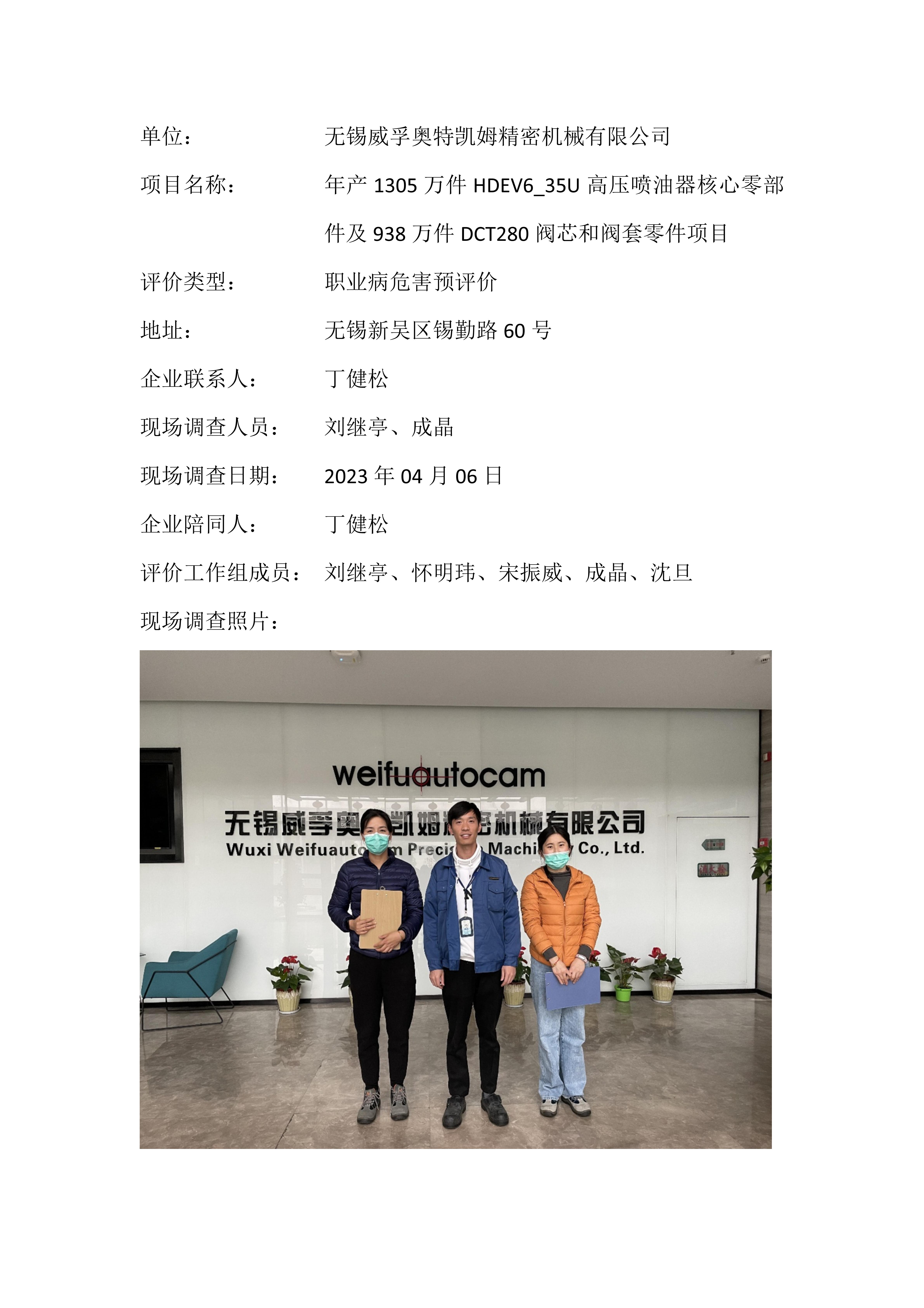 【职业病危害预评价报告】无锡威孚奥特凯姆精密机械有限公司