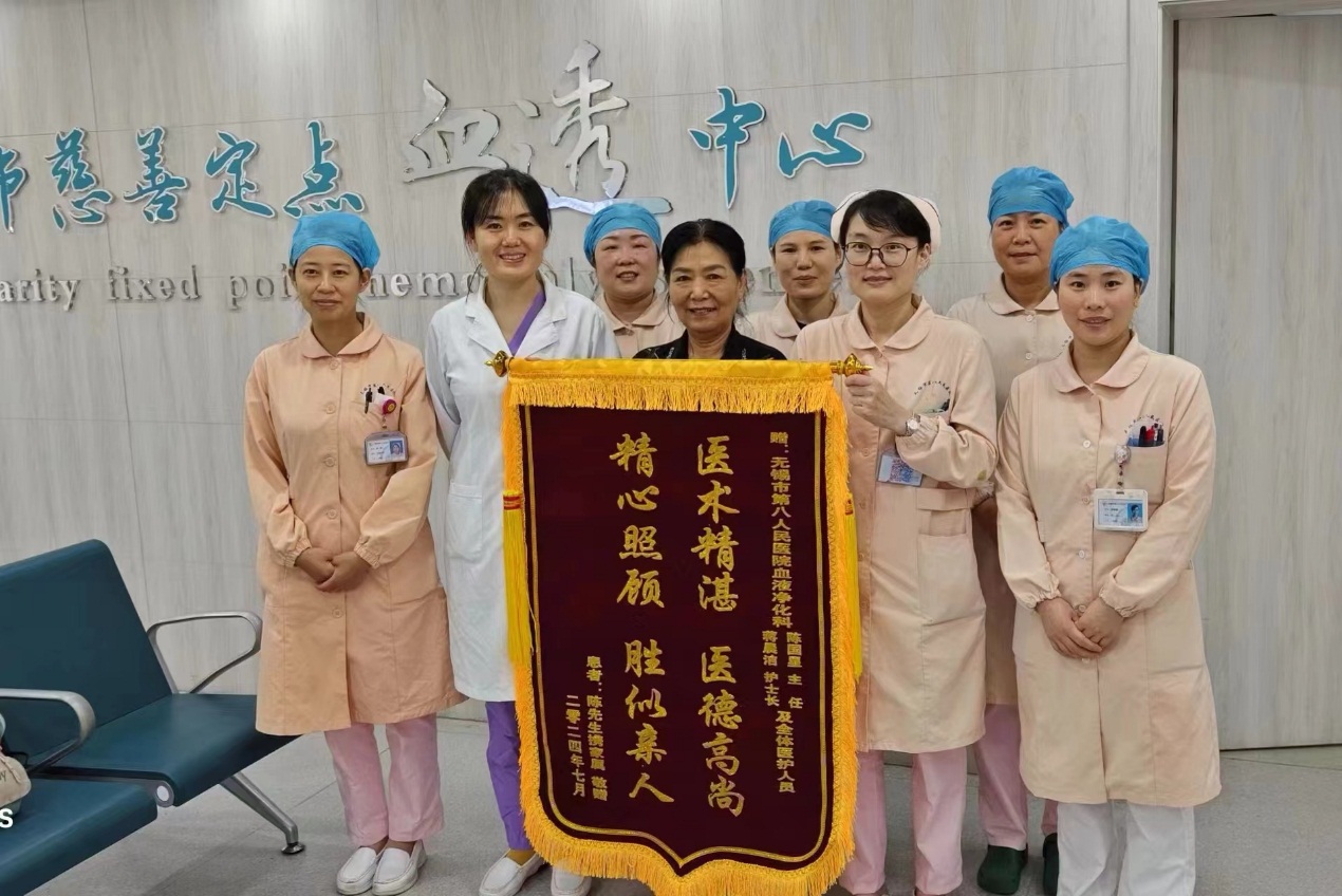 7月中旬,慈善血透中心发生了温馨的一幕,一位血液透析患者将绣有“医术精明 医德高尚 精心照顾 胜似亲人”字样的一面锦旗送至慈善血透中心护士长蒋晨洁手中,以表达对血透中心全体医护的感激之情。