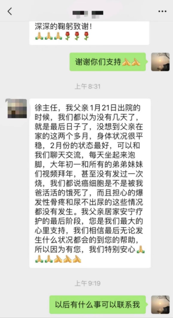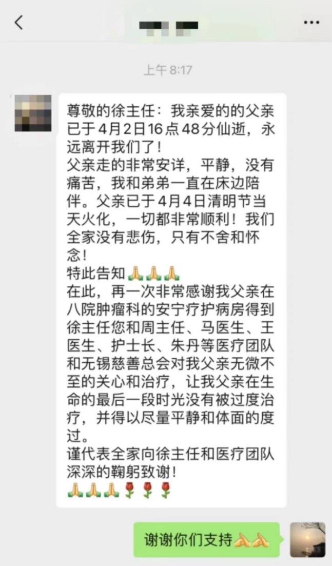 “父亲走的非常安详,平静,没有痛苦,我和弟弟一直在床边陪伴。”“在此,再一次非常感谢我父亲在91制片厂 安宁疗护病房得到徐主任您和周主任、马医生、王医生、周护士长、朱丹丹等医疗团队和无锡慈善总会对我父亲无微不至的关心和治疗,让我父亲在生命的最后一段时光没有被过度治疗,并得以尽量平静和体面的度过。”纸短情深,字字真情。短短数百字的消息,包含着朱老一家人对安宁疗护的认可,对医护人员的感激。