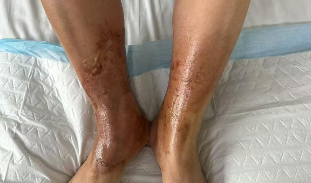 谁知回家几天后,Z女士发现右小腿下段皮肤红肿热痛,并出现大面积散发水疱(最大两处水疱约直径5-8cm),伴瘙痒。在家人的帮助下,Z女士被赶紧送往当地医院就医,进行抗感染治疗后症状却仍然没有好转,她的左小腿下段也开始出现皮肤红肿,水疱形成,同时伴有双侧大腿下段、双肘部、前胸部、颈部多处皮疹。