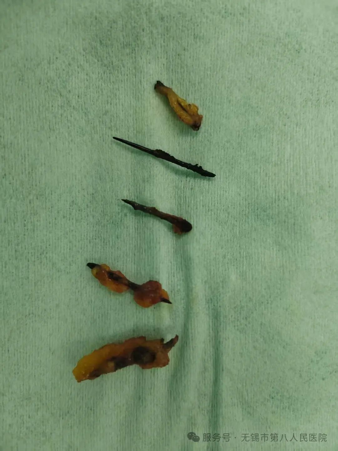 休养了几天后,张女士再一次踏入了手术室,“经历过前一次以后,这一次就没那么紧张了。靠近心脏的那一根被取出后,我对大陈小陈两位医生已经是绝对信任了。”第二次手术结束后,张女士体内共计8根14节异物已被全部取出。