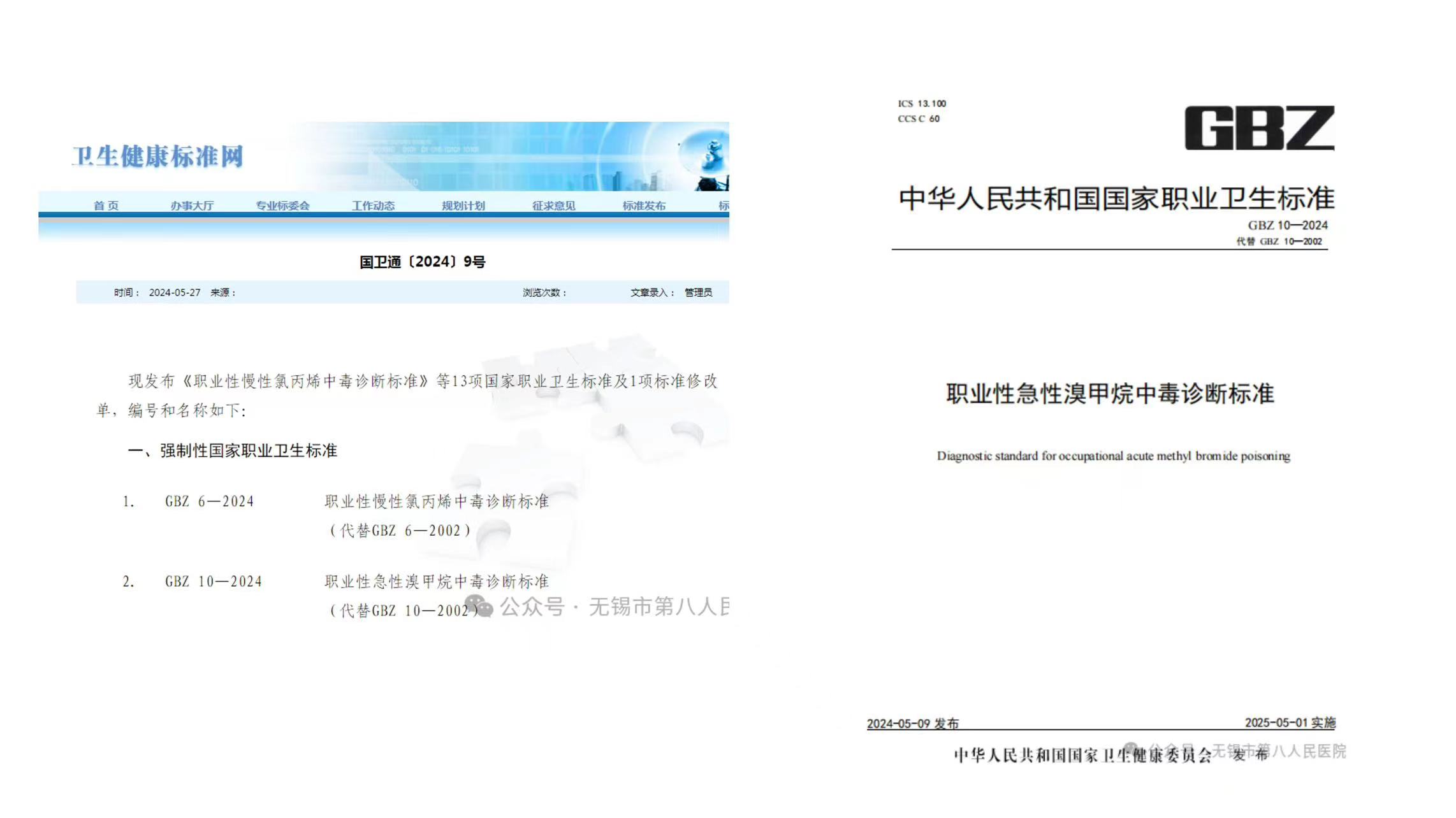 2024年5月9日,国家卫生健康委员会发布了国家职业卫生标准《职业性急性溴甲烷中毒诊断标准》(GBZ 10—2024)。该标准是由我院牵头,江苏省疾病预防控制中心、山东省职业卫生与职业病防治研究院、广东省职业病防治院等多个单位联合参与起草修订。