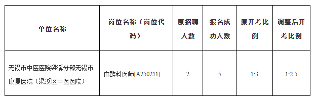 3、根据《2025年无锡市梁溪区卫生健康委下属医疗卫生事业单位公开招聘工作人员公告(普通类)》,下列岗位因报名成功人数未达到开考比例,经市公开招聘综合管理部门核准,予以调整开考比例:
